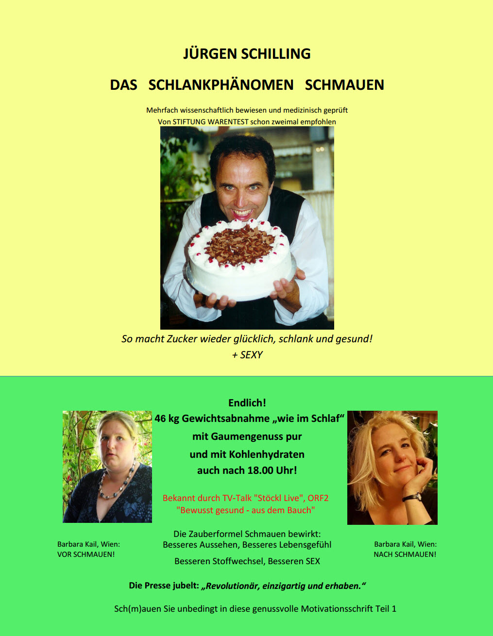Barbara Kail hat kurz vor der Adipositas-Operation (Magenteil-Entfernung) gerade noch das Schmauen entdeckt und durch den Zauberschluck und die Zauberformel des Schmauens 47 kg dauerhaft abgenommen. „Ohne Verbote, ohne Verzicht, ohne Quälerei, nur mit Lust und Gaumengenuss pur“, berichtet sie überglücklich.